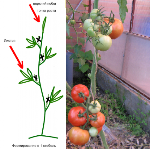 Puede prevenir la aparición de plantaciones engrosadas con la ayuda de pellizcos oportunos de tomates. Los agricultores de tomates altos indeterminados utilizan con más frecuencia el método de formación de un tallo. En este caso, es necesario eliminar todos los brotes laterales.