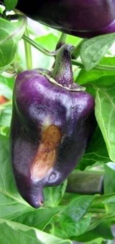 En el pimiento, esta enfermedad no aparece en la parte superior, como en los tomates, sino en las superficies laterales de la vaina. Las áreas llenas de líquido aparecen primero, luego estas áreas se agrandan y se vuelven negras / marrones, correosas y secas. Poco a poco, la superficie afectada se vuelve cóncava. Los sitios pueden tener un tamaño de hasta 8 cm Los pimientos enfermos maduran prematuramente y pueden volver a infectarse con hongos patógenos.