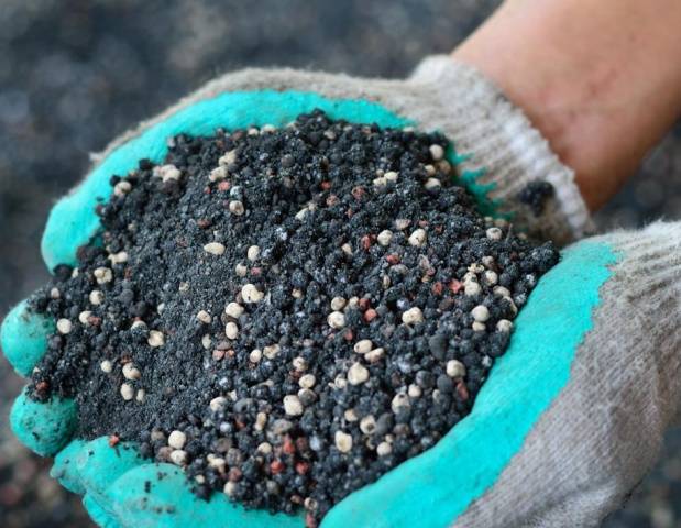 - amoniacado... Esta preparación consiste no solo en fósforo, sino también en azufre en una cantidad de 12% y potasio (aproximadamente 45%). La sustancia es muy soluble en líquido. Adecuado para pulverizar arbustos.