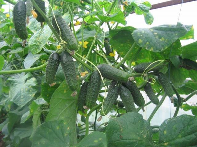 Los arbustos del híbrido son altos y se extienden. Se pueden cosechar hasta 16 kg de pepinos en un metro cuadrado de terreno.