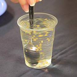 Sumerja las semillas en la solución y revuelva ligeramente para que se humedezcan con agua. Después de 7 a 10 minutos, las semillas buenas se asentarán en el fondo y los aquenios vacíos permanecerán en la parte superior, que deben recogerse y desecharse.