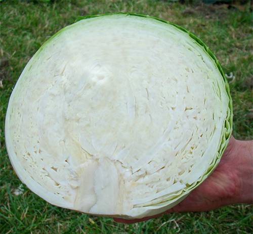 Al cortar una cabeza de repollo "Centurion F1" se pueden ver numerosas hojas blancas bien cerradas. El tocón de la col es ancho, pero corto. Esto permite que se use casi toda la cabeza de repollo para cocinar, eliminando solo una parte pequeña y gruesa de la fruta.