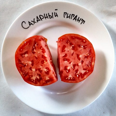 La descripción de la variedad se basa en las revisiones de cultivadores de hortalizas aficionados, ya que no existe tal tomate en el registro de plantas en Rusia, Bielorrusia y Ucrania. Sin embargo, varias empresas de semillas ofrecen semillas de Sugar Giant. La descripción, las fotos y las características de la variedad de diferentes fabricantes pueden diferir ligeramente.