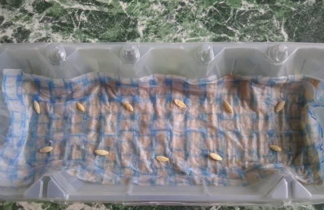 Se requiere un ambiente húmedo para la germinación. Las semillas de pepino se colocan sobre una gasa o paño húmedo y se humedecen por ambos lados. Siempre deben estar mojados, pero no empapados en agua.
