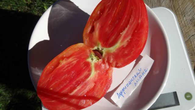Vale la pena señalar que la pulpa es bastante carnosa, en el contexto de un color rojo intenso. Los tomates maduros de la variedad Liana africana se distinguen por su piel delicada y su sabor dulce, en el que hay notas de piña.