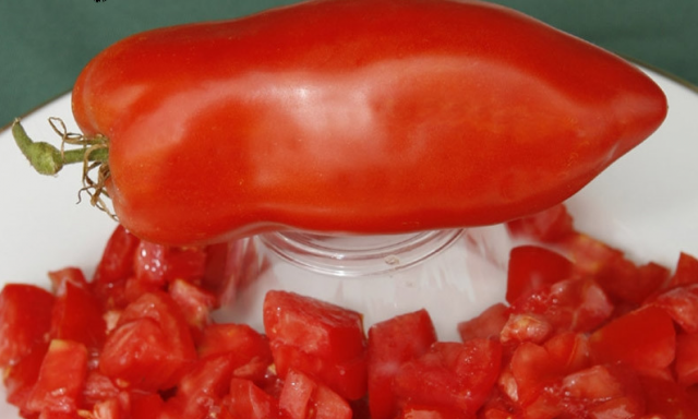 En el contexto de "Plátano rojo", los tomates tienen 2-3 cámaras oblongas llenas de semillas y jugo. La pulpa de los tomates es densa, moderadamente jugosa. Contiene mucha materia seca, azúcar y ácido. Esto determina el sabor de las verduras y su versatilidad. Los tomates son altamente comercializables, adecuados para el transporte y almacenamiento a largo plazo. Se pueden utilizar para preparar bocadillos frescos, salsas, preparaciones de invierno enlatadas. La única limitación de uso es que el jugo de Red Bananas no se puede obtener: será demasiado espeso.