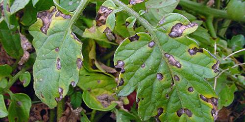 El tizón tardío se desarrolla después de lluvias prolongadas o en condiciones de fluctuaciones bruscas de temperatura. Los signos del tizón tardío son manchas marrones en las hojas y frutos de la planta. Para prevenir la enfermedad, es necesario formar los arbustos de manera oportuna y correcta, eliminando a los hijastros solo en climas secos y soleados. Se puede utilizar una solución salina como profiláctico contra la enfermedad. Se recomienda utilizar Fitosporin para el tratamiento.