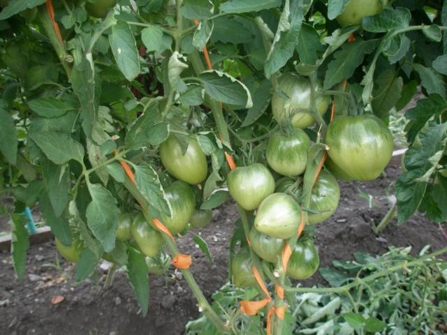 Los arbustos de tomate son bastante poderosos, se ramifican bien y dan un crecimiento fuerte con tallos largos, por lo tanto, requieren pellizcos y ligas obligatorias.