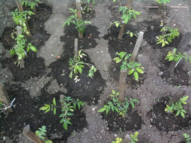 Las plantas se colocan en ellos junto con un terrón de tierra, que se cubre con tierra. Luego, la tierra se pisotea un poco y los tomates se riegan abundantemente.