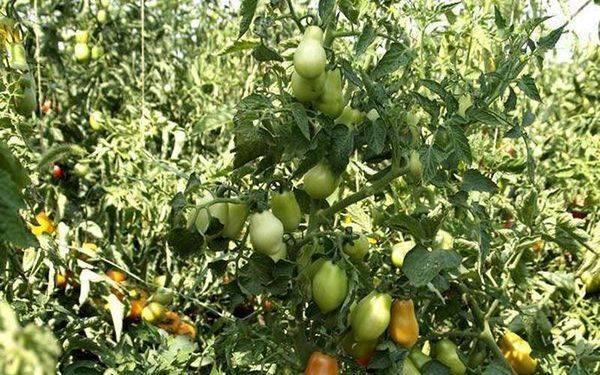 Los arbustos de tomate son bajos. En las crestas no mayores de 60 cm, en invernadero crecen hasta 1 m 20 cm El follaje es medio, las puntas son oscuras con un tono esmeralda. El tipo de planta es carpiano. Las inflorescencias son simples, cada una de ellas atada a 6 frutos.
