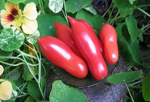 La variedad de tomate está representada por frutos cilíndricos alargados con nervaduras débiles. Hay frutas con una pipeta o con la parte superior redondeada. Cada tomate tiene dos cámaras con una pequeña cantidad de semillas.
