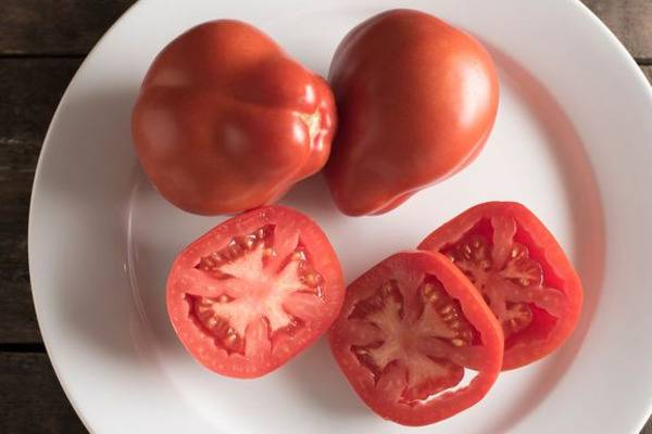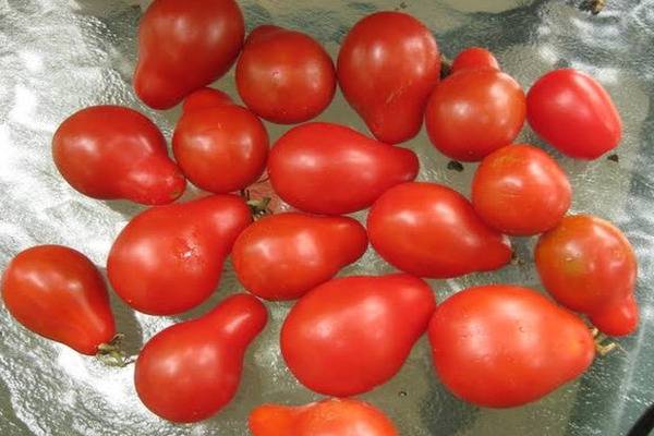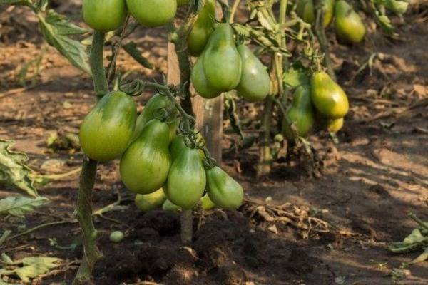 Los tomates de la variedad Grushovka hacen honor a su nombre: las frutas rosa frambuesa crecen como una pera como en la foto.
