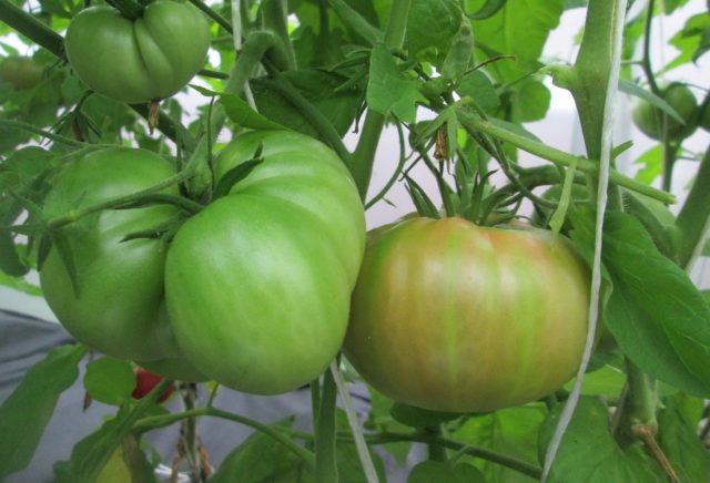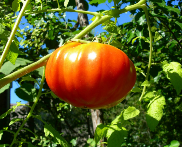 La forma del fruto es redondeada y ligeramente achatada. El tomate está ligeramente acanalado con una piel suave de un intenso color rojo. El peso de una fruta varía de 300 ga 1 kg.