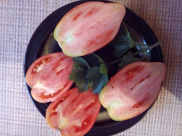 Tomate Eagle Heart, de acuerdo con la descripción, reseñas de jardineros y consumidores, se distingue por una pulpa carnosa, azucarada en la rotura. Los frutos son jugosos, hay pocas cámaras de semillas.