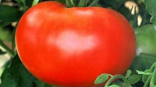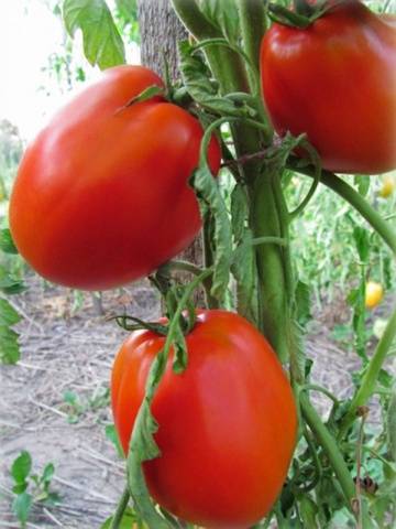 En los dos primeros racimos, los tomates son bastante grandes, a veces su peso alcanza los 300-350 gramos. Se ven deliciosos, tienen una forma ovalada, de color rojo brillante con un tinte de frambuesa. Los tomates cosechados en la primera ola son excelentes para cortar ensaladas frescas.