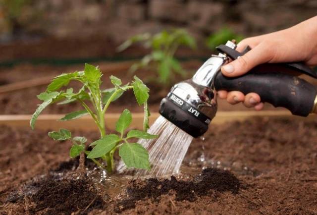 El trabajo se realiza por la mañana o por la noche, cuando no hay exposición directa al sol. El agua no debe caer sobre los tallos o la parte superior de los tomates, se aplica estrictamente en la raíz.