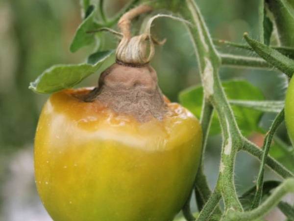 - Enfermedad por hongos fomosis puede infectar los tomates cuajados y ya maduros. La enfermedad se manifiesta como una mancha pútrida marrón en la superficie de la fruta. Su diámetro, por regla general, no supera los 3 cm. Se encuentra en el tallo. El interior de la verdura puede verse completamente afectado por la enfermedad. Una medida preventiva para combatir la enfermedad es rociar las hojas de la planta con el preparado "Hom".Ventilar el invernadero, reducir la cantidad de fertilización nitrogenada y regar también será una buena medida preventiva en la lucha contra la enfermedad.