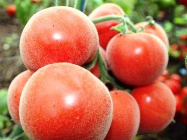 Rosa F1 agrada con la mayor resistencia a las enfermedades y prácticamente no interesa a las plagas. La variedad híbrida también tiene el rendimiento más alto, porque hasta 12 frutos maduran en un racimo de tomate rosa, en lugar del estándar 5-6.El tono de los tomates es cereza claro, están cubiertos de pelusa blanca.