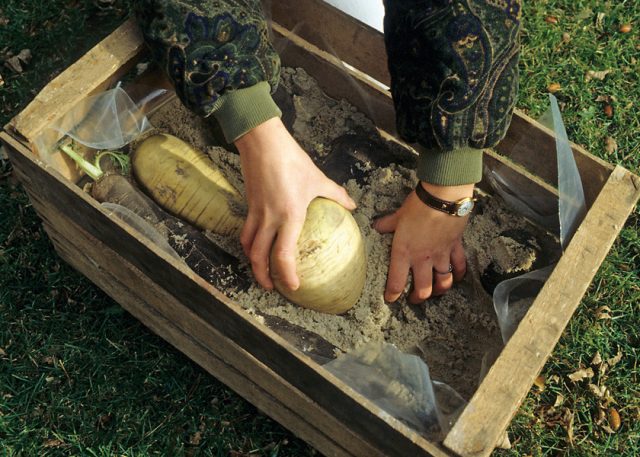 Las muestras sanas se colocan para su almacenamiento sin daños. Es mejor almacenar los nabos en un recipiente rígido, pero no junto con otros tipos de tubérculos. Almacene las verduras en habitaciones frescas, refrigeradores o balcones a una temperatura de 0 ... + 2 ° C. Los cultivos de raíces son adecuados para colocar en pilas y zanjas con una capa de arena o tierra. Cuando se almacena correctamente, el nabo permanece sin cambios hasta la próxima cosecha.