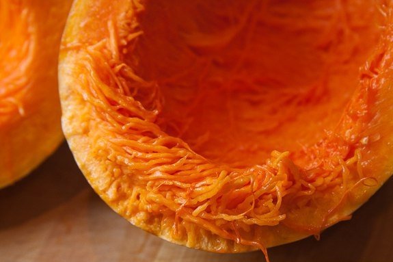- Enfríe la calabaza terminada, separe con cuidado las fibras de espagueti para no dañar la cáscara.