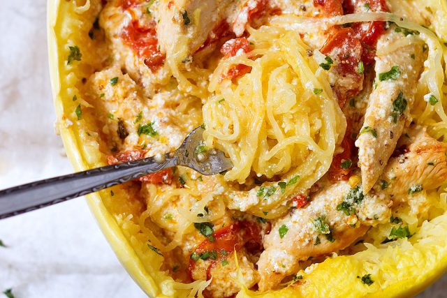 Una de mis recetas favoritas es Calabaza espagueti al horno rellena de pollo. El plato resulta sabroso, satisfactorio, contiene mucho queso.