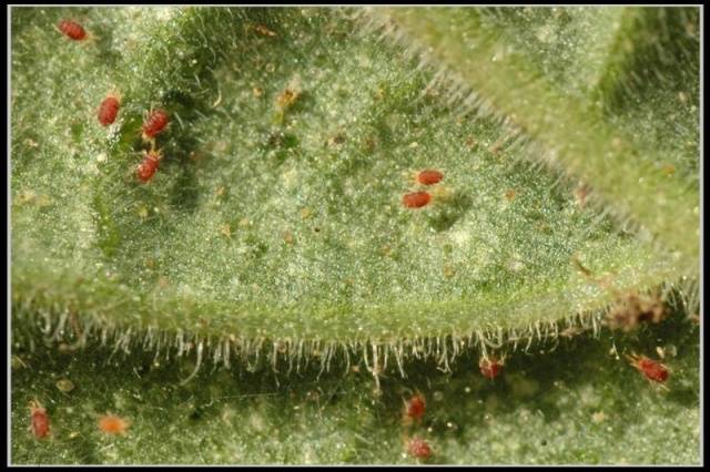 La plaga es de tamaño muy pequeño, trenza los arbustos de tomate con una fina telaraña y succiona la savia de la planta. Como resultado, las hojas de tomate se secan y se caen. Las garrapatas generalmente existen en colonias y se esconden en la parte inferior del follaje, debajo de matas de tierra y hojas caídas.