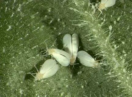 Estas plagas de tomates en invernadero son pequeños insectos, cuyas larvas se adhieren a las hojas y se alimentan del jugo. Pueden detectarse por algunos signos:
