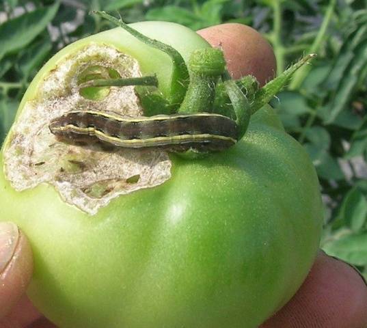Esta plaga de tomate, que es una oruga de hasta cuatro centímetros de tamaño, se refiere a invisible, ya que se esconde en el suelo durante el día y se alimenta de una planta por la noche. Después de invernar, las orugas adultas roen los tallos de los tomates y las larvas se alimentan de la pulpa de la fruta, penetrando en el interior. Por la noche, las orugas también alcanzan los frutos y hojas de los tomates y los muerden. Durante la noche, una persona puede arruinar 10 arbustos.