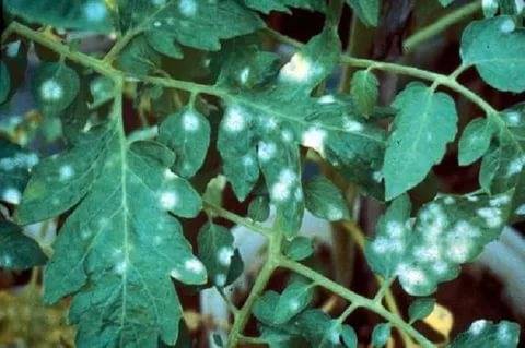 Ocurre cuando se forma humedad por goteo en el invernadero. Sus primeros signos aparecen en forma de una capa blanca en las hojas, que recuerda a la harina esparcida. Con desarrollo enfermedad del tomate deja rizo y se cae, la planta muere. Es difícil lidiar con el mildiú polvoriento. Como medio de control, puede utilizar soluciones de pulverización: