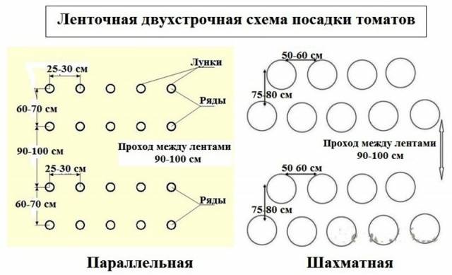 - El esquema de ajedrez de anidación de cintas implica dividir el sitio en crestas. La distancia entre dos surcos adyacentes debe ser de aproximadamente 130-140 cm. Los tomates se plantan en la cresta resultante en dos filas (cintas) a una distancia de 75-80 cm en un patrón de tablero de ajedrez.Los orificios de una cinta se colocan al menos a 60 cm de distancia. En cada hoyo o el llamado nido se plantan dos arbustos de tomate a la vez, lo que facilita el amarre de las plantas.