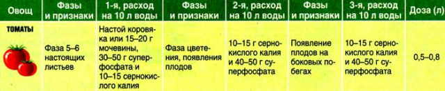 En el proceso de formación de flores y maduración de frutos, los tomates requieren potasio y fósforo. Estos minerales se pueden aplicar utilizando fertilizantes compuestos universales o minerales simples, ceniza de madera. Una cantidad suficiente de potasio en el suelo hace que el sabor de los tomates sea rico, aumenta la cantidad de azúcar y materia seca en las verduras. Además, los oligoelementos aceleran el proceso de formación y maduración de la fruta. A continuación se muestra un programa aproximado para la aplicación de fertilizantes minerales.