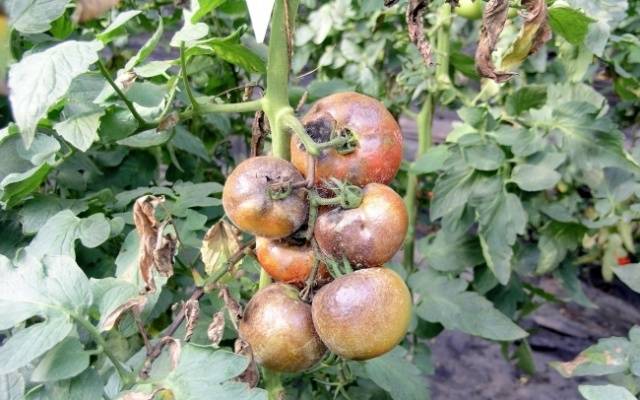 La enfermedad fúngica más común al aire libre es el tizón tardío. Sus hongos son transportados por el viento y las gotas de agua. Al tocar las heridas del tomate, el hongo provoca ennegrecimiento y secado de hojas, troncos, aparición de manchas negras y densas en la superficie de la fruta. Puede combatir el tizón tardío y otras enfermedades con la ayuda de medidas preventivas. Por ejemplo, rociar los arbustos con una solución de suero cada 10 días protegerá de manera confiable los tomates de los hongos y no dañará la calidad de los tomates maduros. Entre las preparaciones químicas, Fitosporin y Famoksadon son muy eficaces contra el hongo Phytophthora.