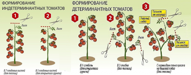 La formación de tomates consiste en pellizcar, pellizcar y quitar las hojas inferiores. Los arbustos se forman según su tipo. En la foto se muestran ejemplos de la formación de tomates en uno, dos y tres tallos: