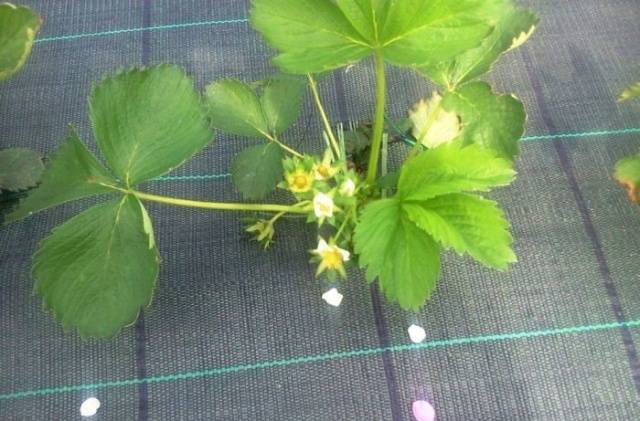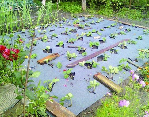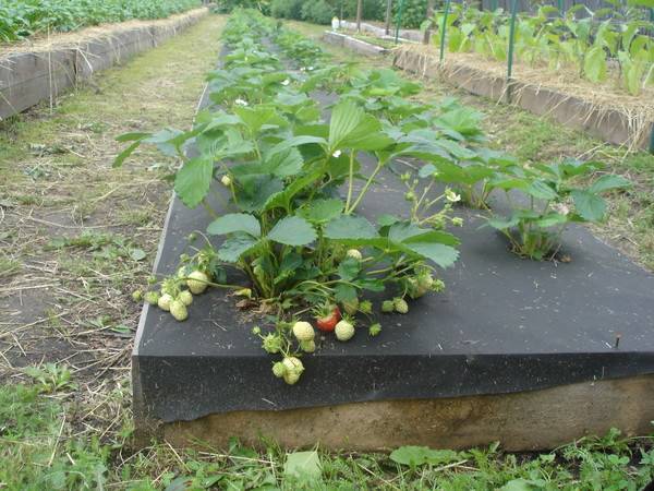 También fue muy popular en los viejos tiempos para albergar fresas. película negra de malezas... Esta opción realmente protege las plantaciones de fresas de las malezas, pero crea condiciones favorables para el desarrollo de babosas, así como muchas enfermedades fúngicas. Por lo tanto, es recomendable usar la película solo en un cultivo anual, cuando las fresas remontantes se cultivan solo durante una temporada.
