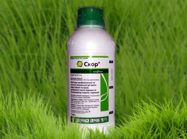 La droga penetra en los tejidos vegetales e inhibe la actividad vital del hongo. Skor tiene un buen rendimiento, bloquea la reproducción del hongo ya 2 horas después de su uso.