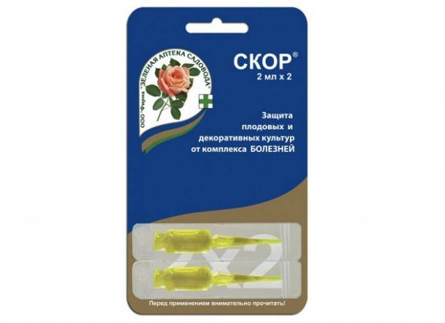 El jardín de flores se trata mediante pulverización. El procesamiento de hojas se lleva a cabo 2-3 veces por temporada. El fungicida Skor actúa durante 3 semanas.