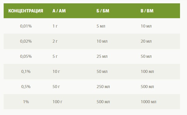 Una preparación seca, independientemente de la forma de los gránulos, se disuelve bien en agua. La solución se prepara en la dosis requerida antes de su uso. Es importante tener en cuenta que el concentrado tiene una reacción alcalina pronunciada. Es óptimo seleccionar inmediatamente la cantidad correcta de agua y gránulos para obtener una solución de trabajo de baja concentración.