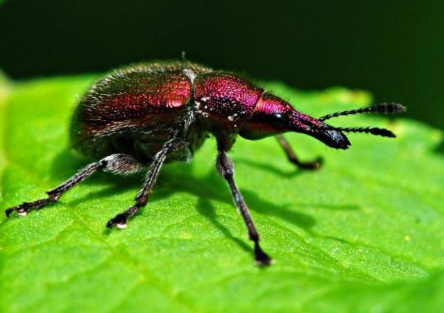 Entre las fotos y descripciones de plagas en las cerezas, hay un gorgojo; en la edad adulta, es un escarabajo verde con un tinte bronceado y rojizo del cuerpo. Las larvas de la plaga hibernan en el suelo cerca del tronco de la cereza y se despiertan a principios de la primavera, después de lo cual se mueven hacia el tronco y los brotes.