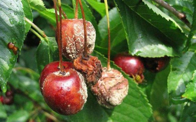 Una enfermedad fúngica peligrosa para las cerezas es la antracnosis que afecta la maduración de los frutos. Primero, aparecen áreas pequeñas y claras en las bayas de cereza, que se convierten rápidamente en tubérculos densos, cubiertos con una flor rosa. Luego, las frutas comienzan a secarse y mueren por completo en un corto período de tiempo.