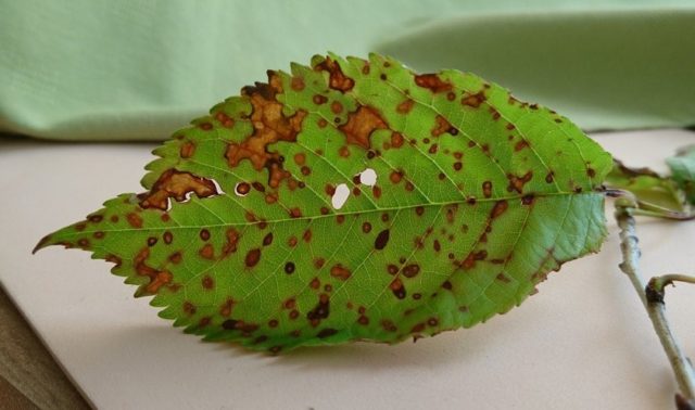 Los síntomas de la enfermedad de clasterosporium son manchas rojas con un borde de frambuesa que aparecen en las hojas jóvenes. Pequeñas al principio, las manchas aumentan rápidamente de diámetro y luego se vuelven marrones y marrones. Las hojas se secan en las manchas y el tejido muerto se cae, dejando agujeros. La clasterosporiosis daña las cerezas, ya que puede provocar la muerte completa de la masa verde y detener el desarrollo de la planta.