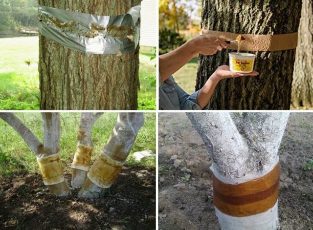 El cinturón de caza se envuelve alrededor del tronco del árbol, cerrando la línea. La cinta adhesiva se enrolla alrededor del tronco de la cereza con el lado adhesivo hacia arriba. Hacer tales trampas no es difícil, pero lo principal aquí: preparar el tronco del árbol.