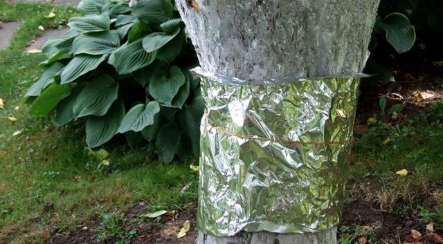 Algo parecido a una falda, pero con graves defectos. Necesitará una tira de papel de aluminio para fabricar este dispositivo. A unos 2 cm del borde que quedará la parte superior se dobla en ángulo recto y se hacen pequeños cortes. Estos últimos son necesarios para que la lámina quede más suave sobre el tronco de la cereza. Después de eso, el material se envuelve alrededor del árbol y se fija.
