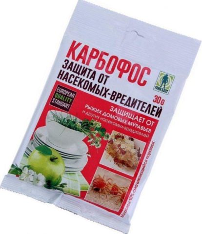 A veces, también hay recomendaciones para usar este medicamento para deshacerse de los insectos rastreros en los árboles. Pero es más adecuado para uso en interiores que para espacios abiertos. Principio activo: diazinón 60%. Producido en forma de concentrado líquido. La solución se usa en lugares donde se congregan las hormigas.