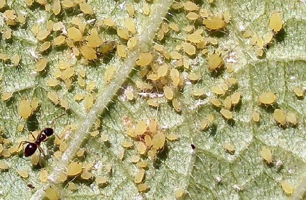 No menos daño a las plantas es causado por las secreciones de pulgones, una dulce melaza que atrae a las hormigas. Esta sustancia blanca pegajosa recubre las hojas, cierra los poros y bloquea el intercambio de aire. Las hormigas que se alimentan de mielada utilizan los pulgones como una especie de vacas lecheras, trasladándolas a nuevas áreas y protegiéndolas de todos los modos posibles de los peligros.