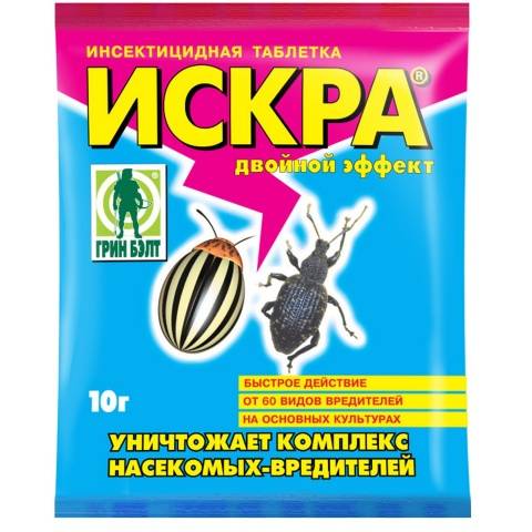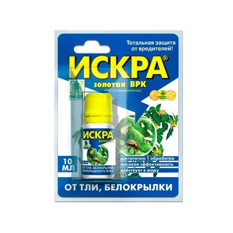 Iskra Zolotaya está diseñado para proteger las plantas del escarabajo de la patata de Colorado, pulgones y trips. La herramienta tiene un efecto duradero y, después de su uso, conserva sus propiedades durante un mes.