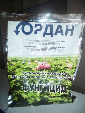 - Ordan - contiene oxicloruro de cobre, que tiene un efecto perjudicial sobre las esporas de hongos. Los componentes de la preparación penetran en las capas profundas de las plantas, donde destruyen las lesiones y restauran los tejidos vegetales. Por 5 litros de agua, se diluyen 25 g de Ordan. El procedimiento se realiza dos veces con un descanso de 7 días.