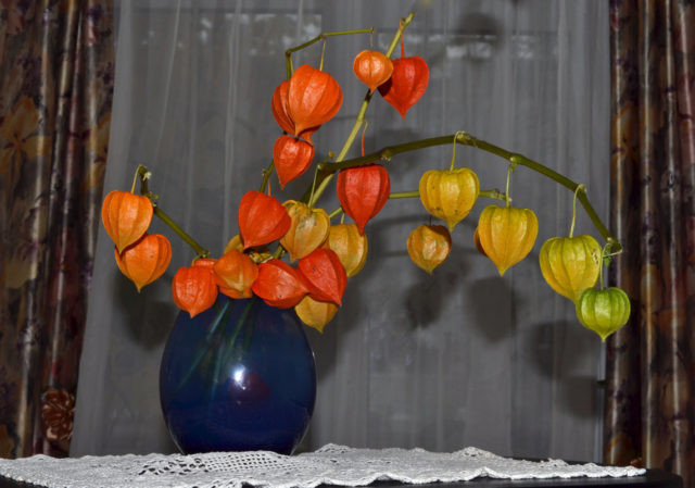 En nuestro clima, en campo abierto, solo arbustos de physalis invernales u ornamentales. Las frutas coloridas en forma de farol se cortan cuando adquieren un tono rico. De lo contrario, durante las lluvias de otoño, la cáscara seca en campo abierto se oscurece. Los arbustos pueden soportar heladas hasta -30 ° C. Por lo general, no se recortan ni se cubren. Se sientan cada 5-6 años.