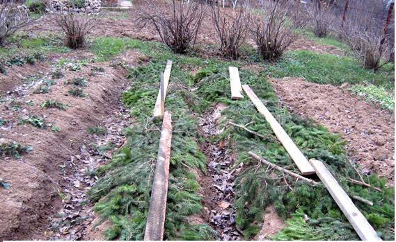 Con la llegada del calor, en abril, es necesario levantar el material de cobertura de las crestas y alimentar a las plantas con fertilizante complejo. Las hojas secas y la basura deben eliminarse del jardín, cortar los arbustos.