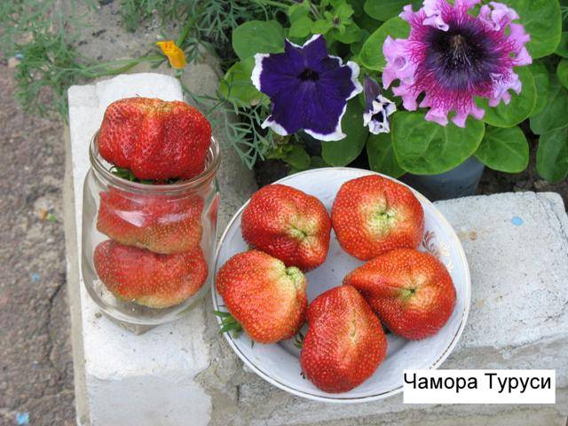 Esta variedad, a pesar de su origen misterioso, es famosa por sus cosechas. De un arbusto, puede obtener hasta 3 kg de bayas gigantes dulces, como en la foto. Con el cuidado y la alimentación adecuados, la masa de bayas puede alcanzar los 120-130 gramos. Pero, desafortunadamente, Chamora Turussi es muy inestable a las enfermedades fúngicas y bastante exigente de cuidar.