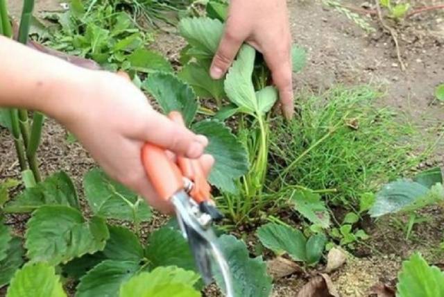 - Corte solo las hojas de las hojas. Deje pecíolos de hasta 10 cm de tamaño en el arbusto. Por lo tanto, protegerá de manera confiable el punto de crecimiento de las fresas contra daños y preservará la futura cosecha de bayas dulces.